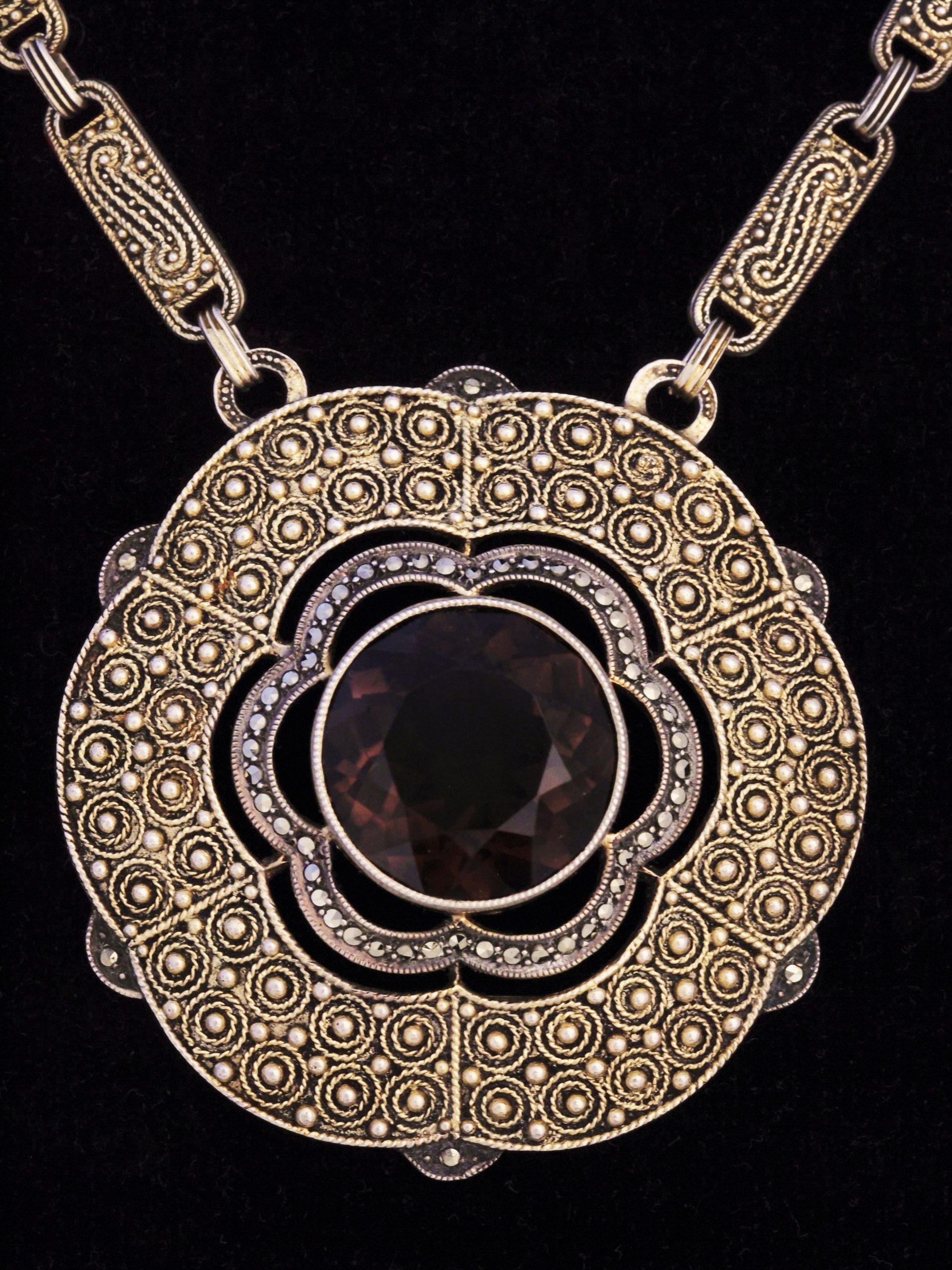 Silver gilt pendant necklace set with faceted central stone somewhere between a citrine and smoky quartz in appearance.