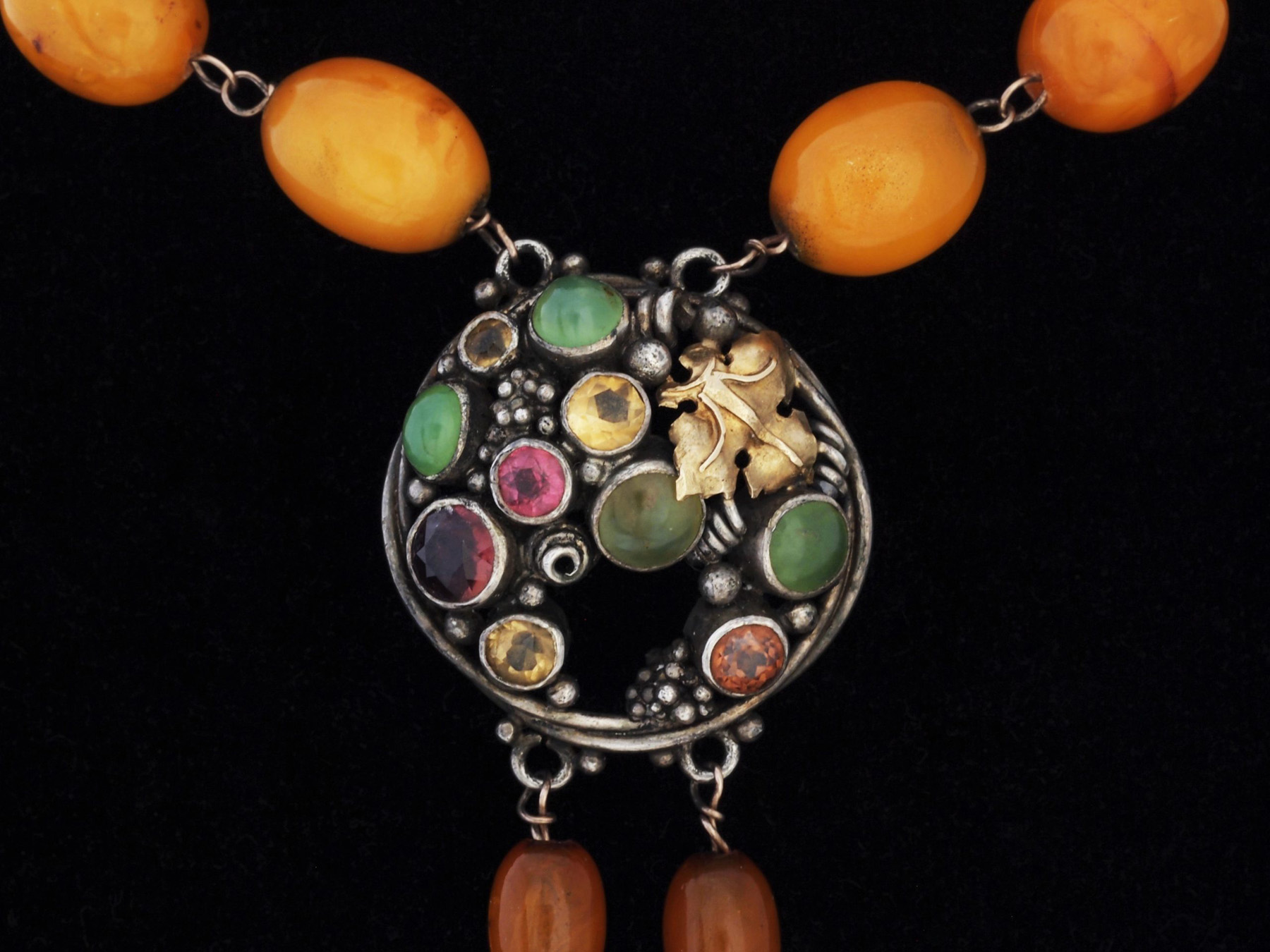 Unusual necklace of amber beads in two sections, separated by a silver and gold circular detail set with assorted stones in typical Dorrie Nossiter fashion.