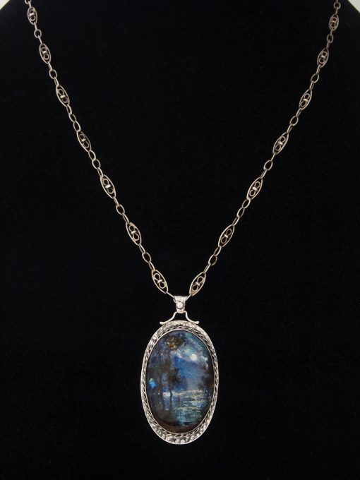 The upright oval enamelled plaque depicts a moonlit lakeside scene with tall trees to one side in typical Varley style. It is backed by a hammered silver mount that extends slightly at the edges, with a rope patterned border abutting the rub-over setting.