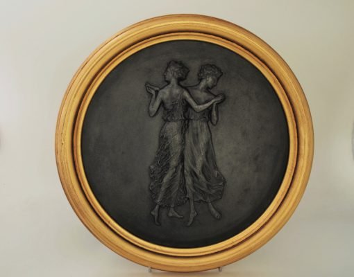 French circular cast iron picture in high relief of two young women wearing long, diaphanous gowns, dancing together rather dreamily.
