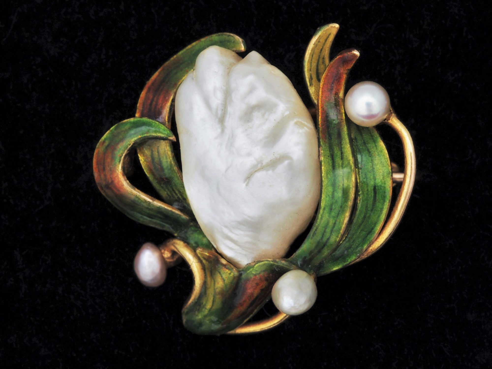 Beautiful Art Nouveau brooch in 14 ct gold in the form of sinuously curving strappy leaves framing quite the largest and most stunning freshwater pearl we have seen in a long time.