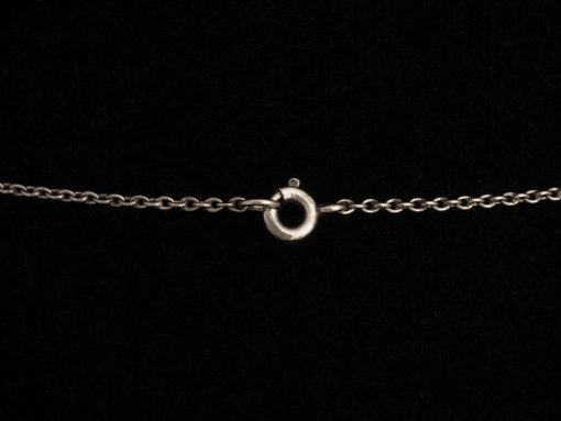 On a platinum chain which is removable via a little screw fitting at the top of the back. Presumably this is to give the option of having a pin fitted so as it could also be worn as a brooch, but thus far this option has not been taken up.
