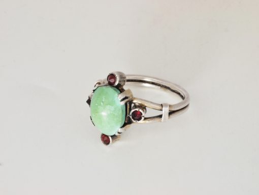 Silver ring set with a central oval amazonite cabochon and four little garnets, two at the shoulders and one each above and below the main stone.