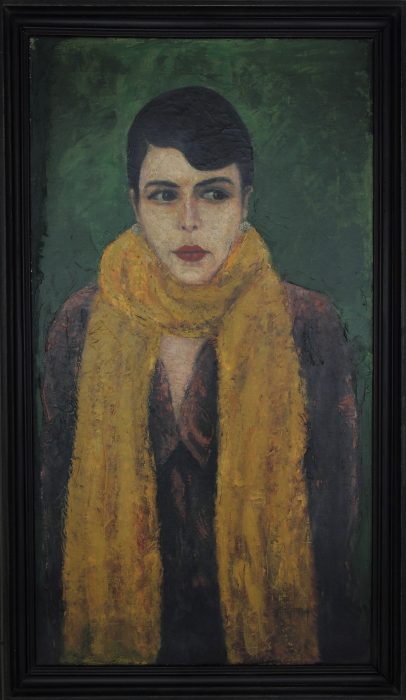 The bright red lipstick she wears accentuates the outline of her mouth, adding a strong splash of colour to the image as does the long yellow scarf that falls down on both sides from around her neck.