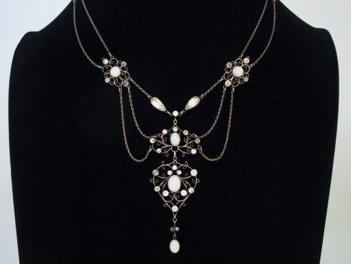 Three short lengths of chain on each side connect the two central elements to a pair of matching side attachments which, in turn connect to double chains separated first by opals and finally with crystal stones. A single length of chain attaches to the hand made toggle type fastener.