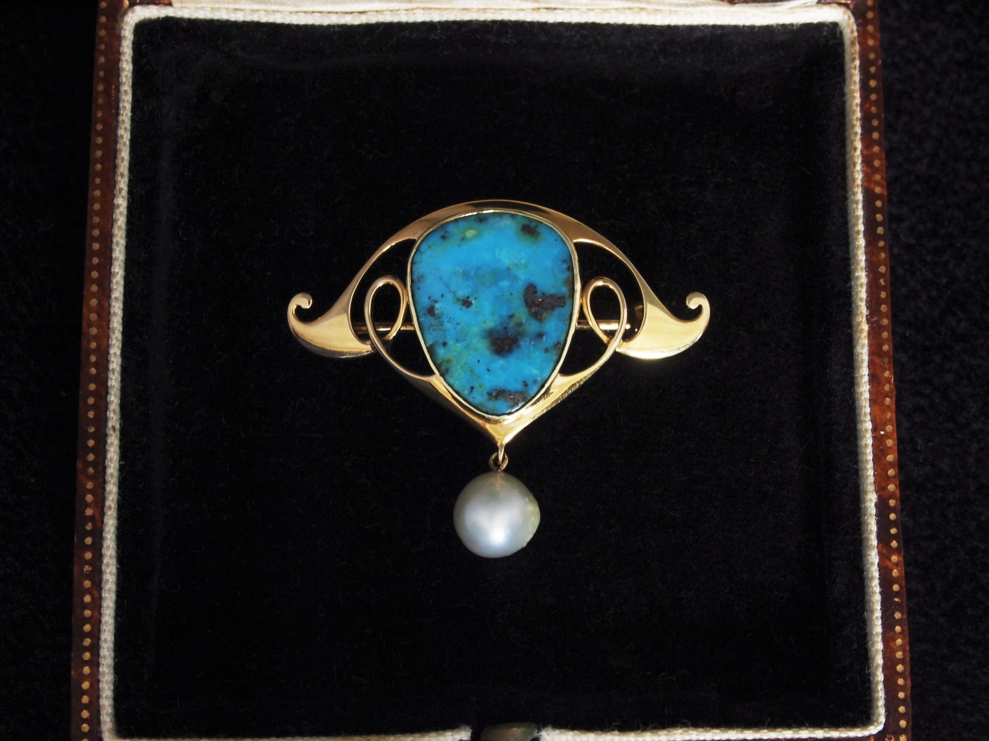 Art Nouveau 15 ct. gold brooch by Murrle Bennett & Co., set with a flat-topped turquoise matrix stone.