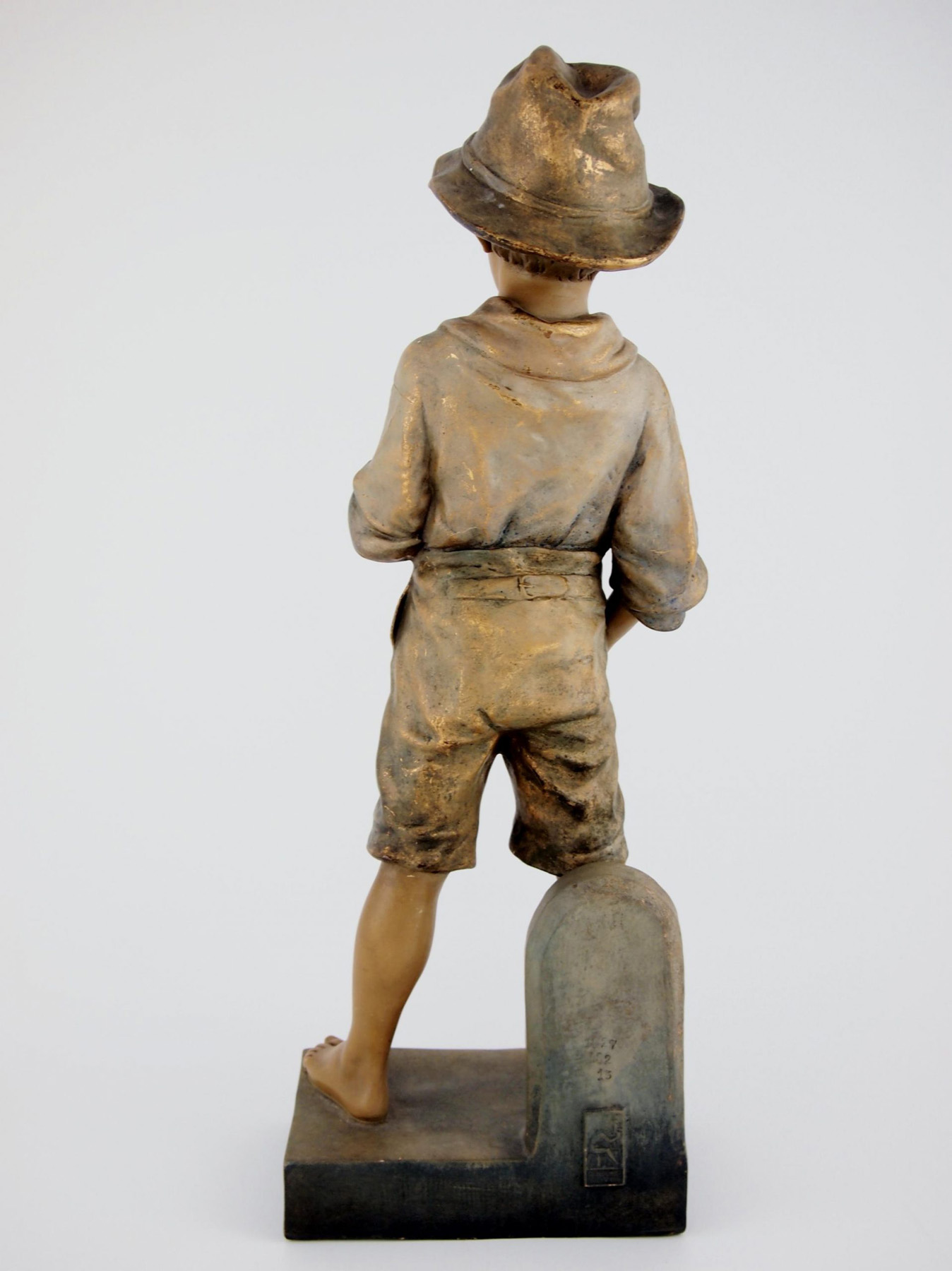 Another fine terracotta statue from Goldscheider. This one dates from c. 1898-99 and is of a young, barefoot country boy wearing a hat that’s a size too large for him and holding a cigarette between his fingers.