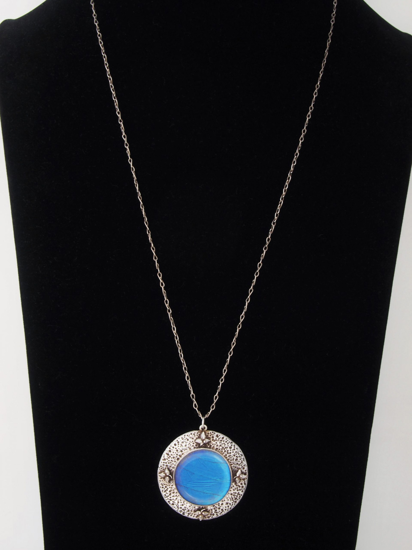 In the centre is set a vividly coloured blue butterfly wing beneath a clear protective cover.