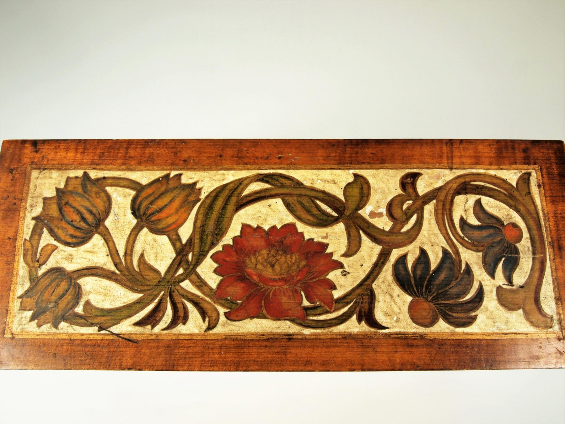 Fashioned from solid Sycamore, with inset panels hand painted in floral and foliate designs showing on all four sides. The hinged lid is also decorated with an ornate floral display.