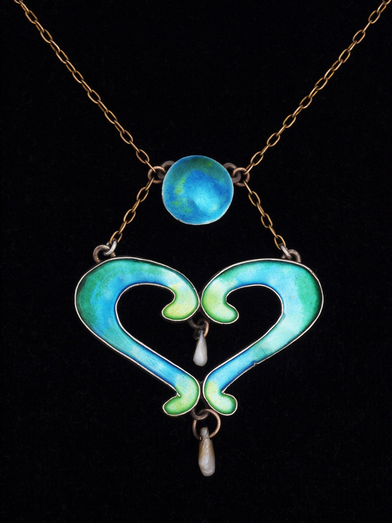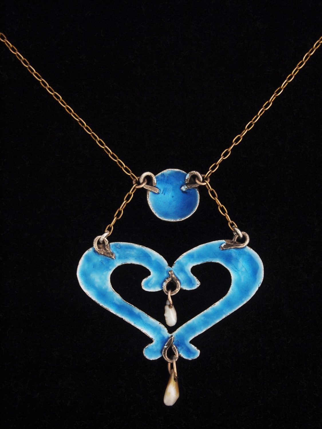 Arts & Crafts enamelled pendant of an open stylised heart shape with a little baroque pearl suspended in the centre and another forming the drop below.