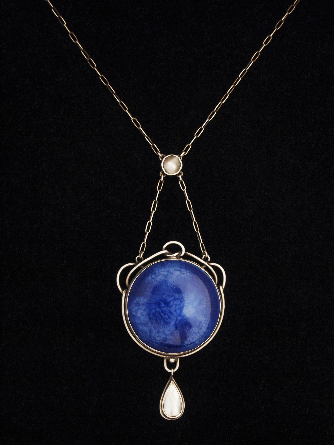 Silver pendant necklace from Charles Horner set with a circular mottled blue Ruskin polished ceramic stone.