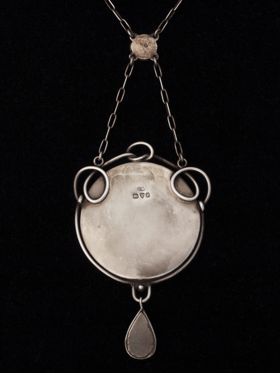 With a design of interlaced silver wirework above and a little mother-of-pearl drop set in a silver mount below, the pendant hangs on two short lengths of chain from a mother-of-pearl set suspender which connects to the necklace chain.
