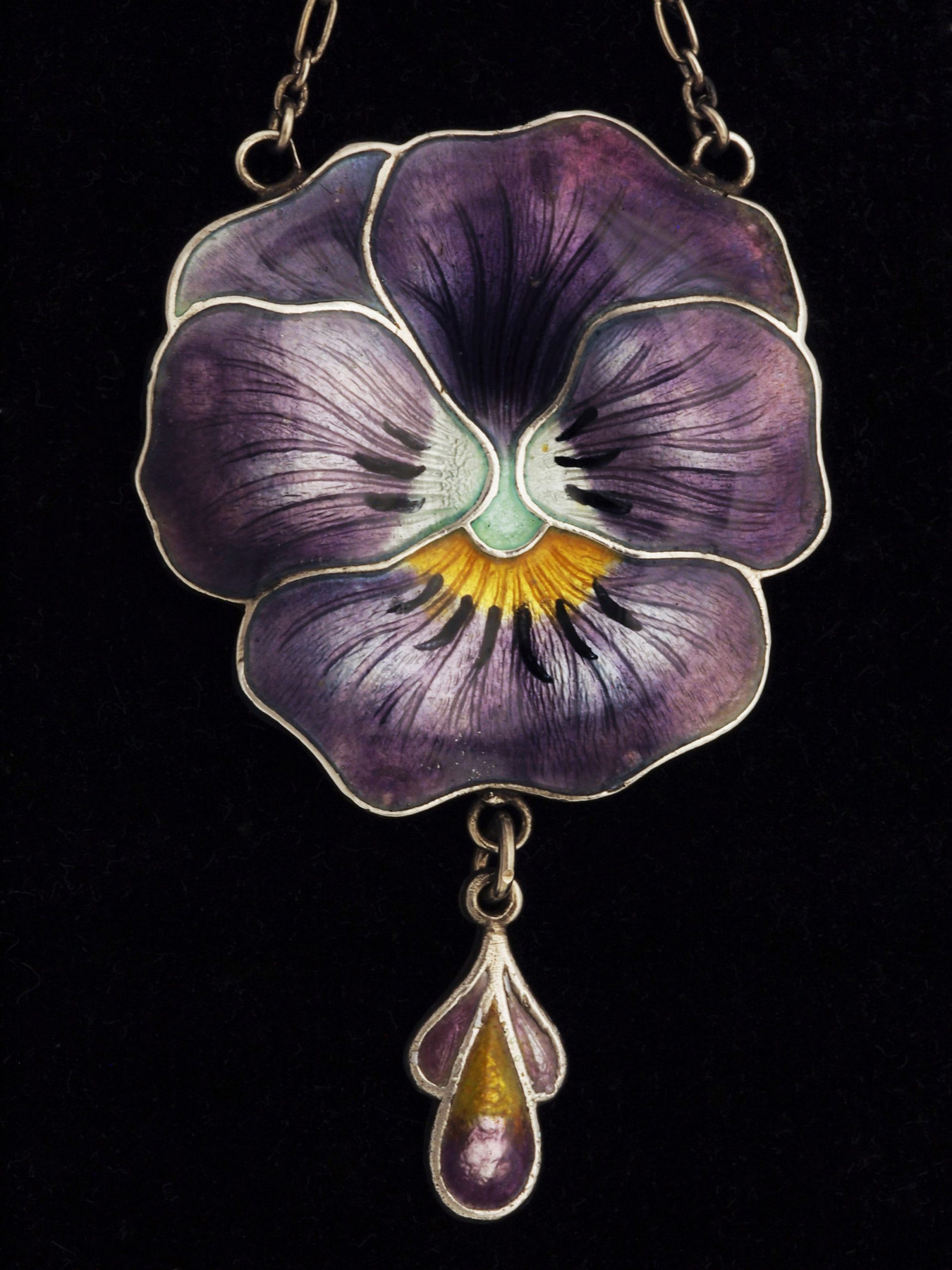 Art Nouveau silver and enamel pendant in the form of a pansy flower by the Birmingham maker J. Aitkin & Son whose workshop was located in Spencer Street in that city.