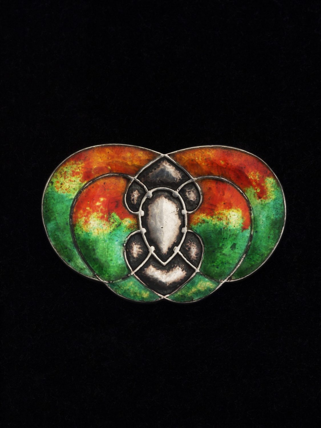 Silver and polychrome enamel brooch dating from the very ealy 1900’s, designed by Jessie M. King and made by W.H. Haseler.