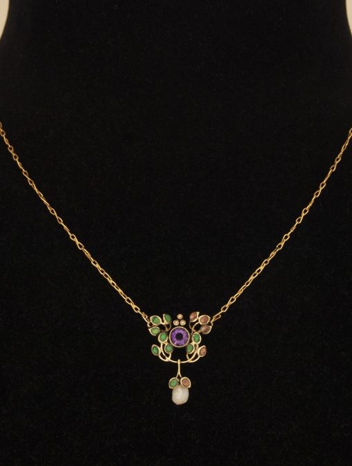 An amethyst is set in the centre and a fixed pearl sits below the pair of leaves at the foot.