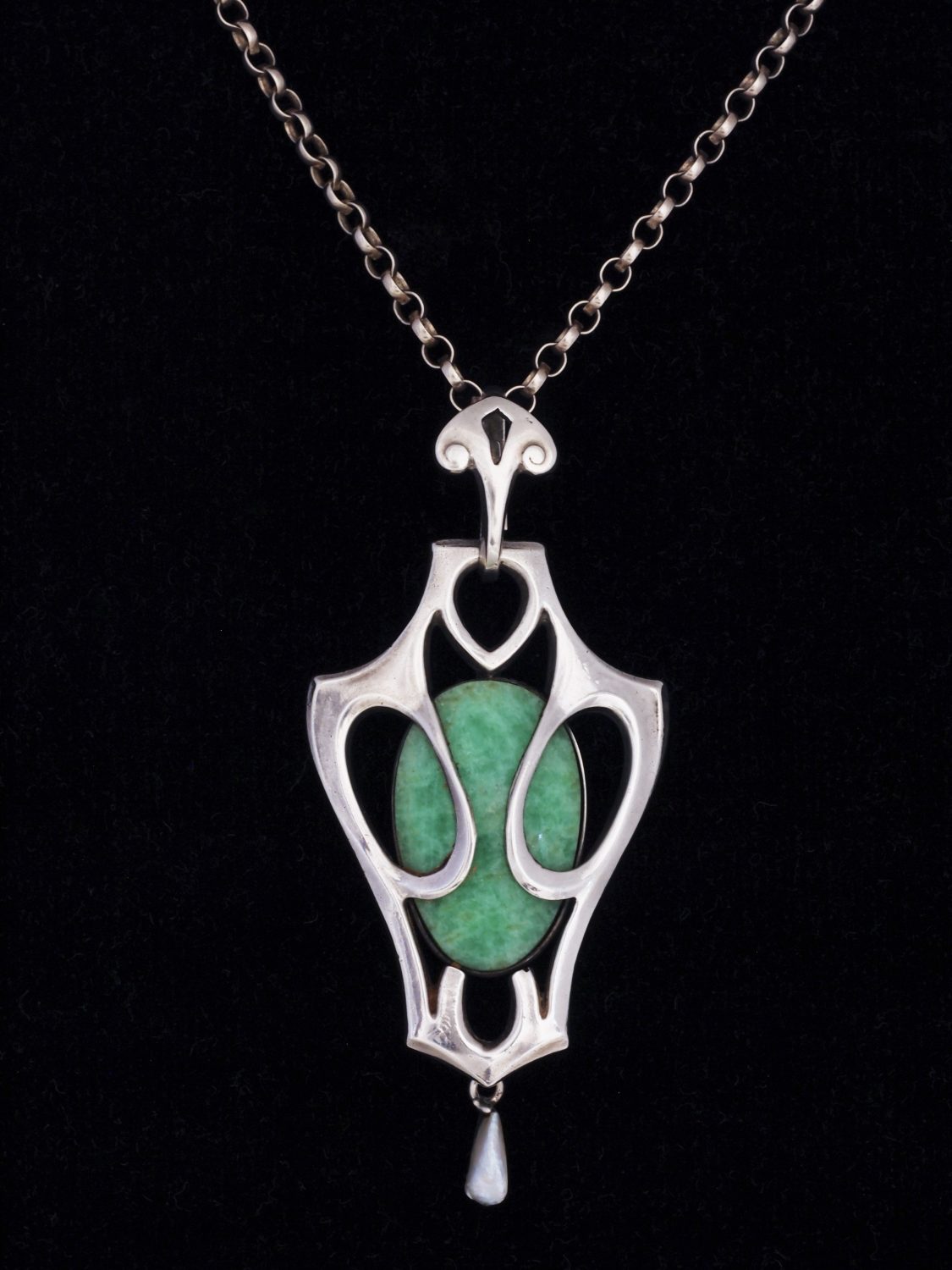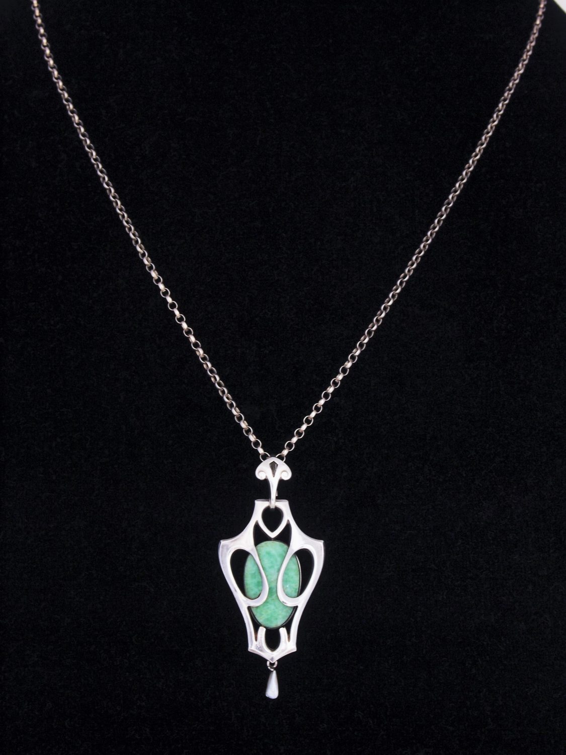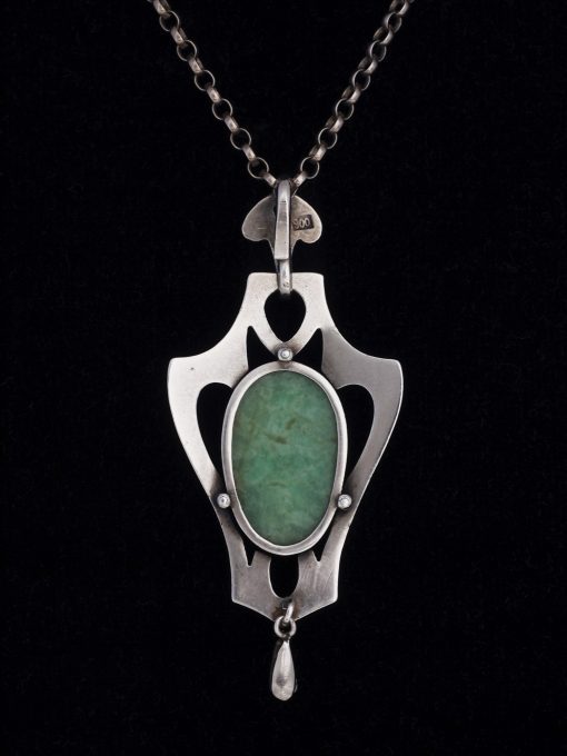 German Jugendstil openwork silver pendant with a shield-shaped outline framing an oval aventurine stone.