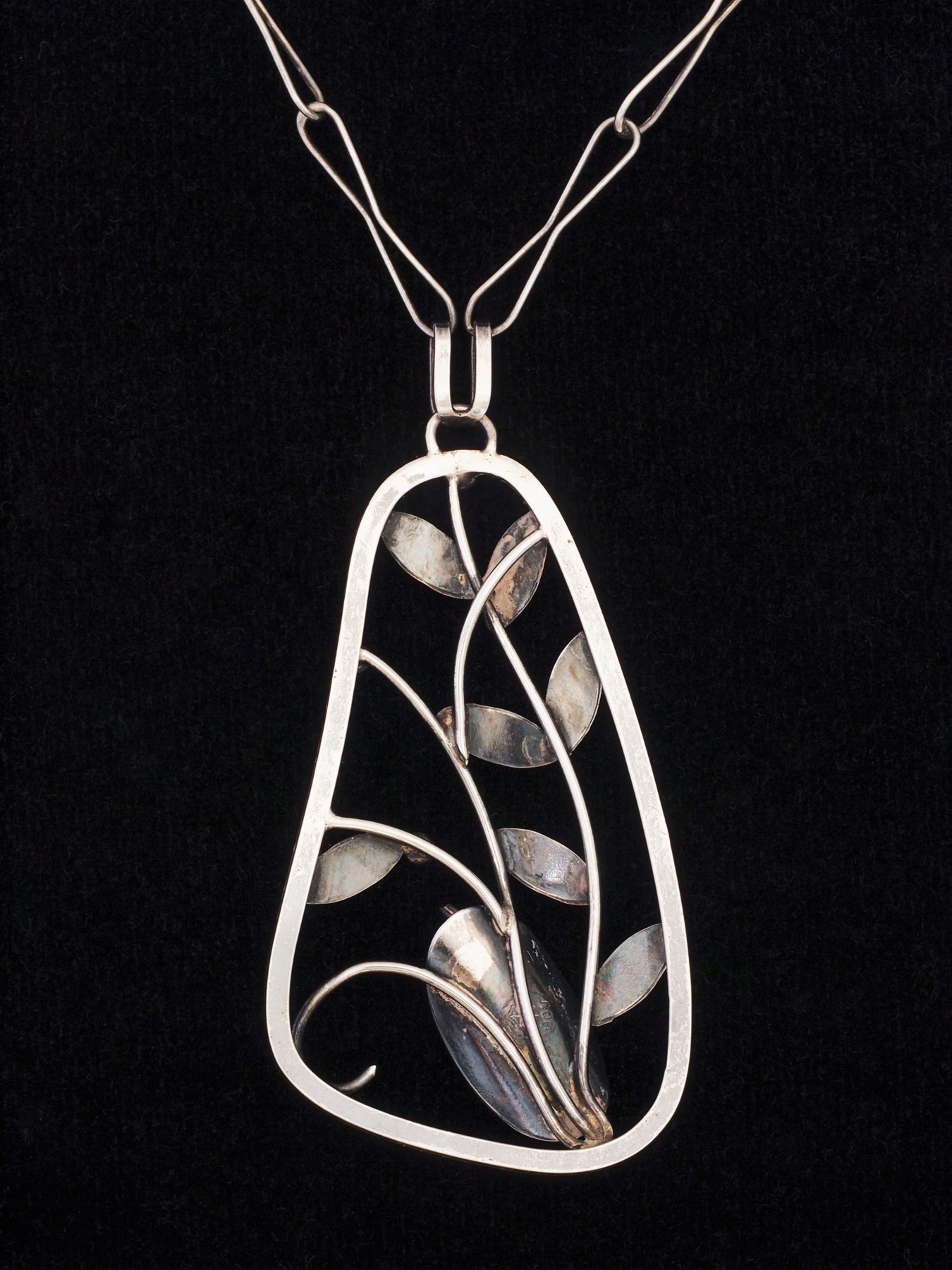 German Jugendstil pendant marked for 900 silver in an openwork foliate design within an offset pear-shaped outline.