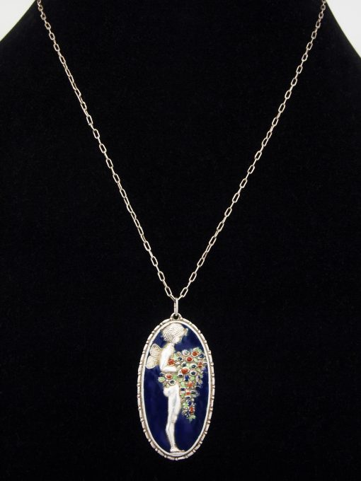 Austrian Jugendstil upright oval silver pendant with a fairy standing side-on, holding a large bunch of flowers.