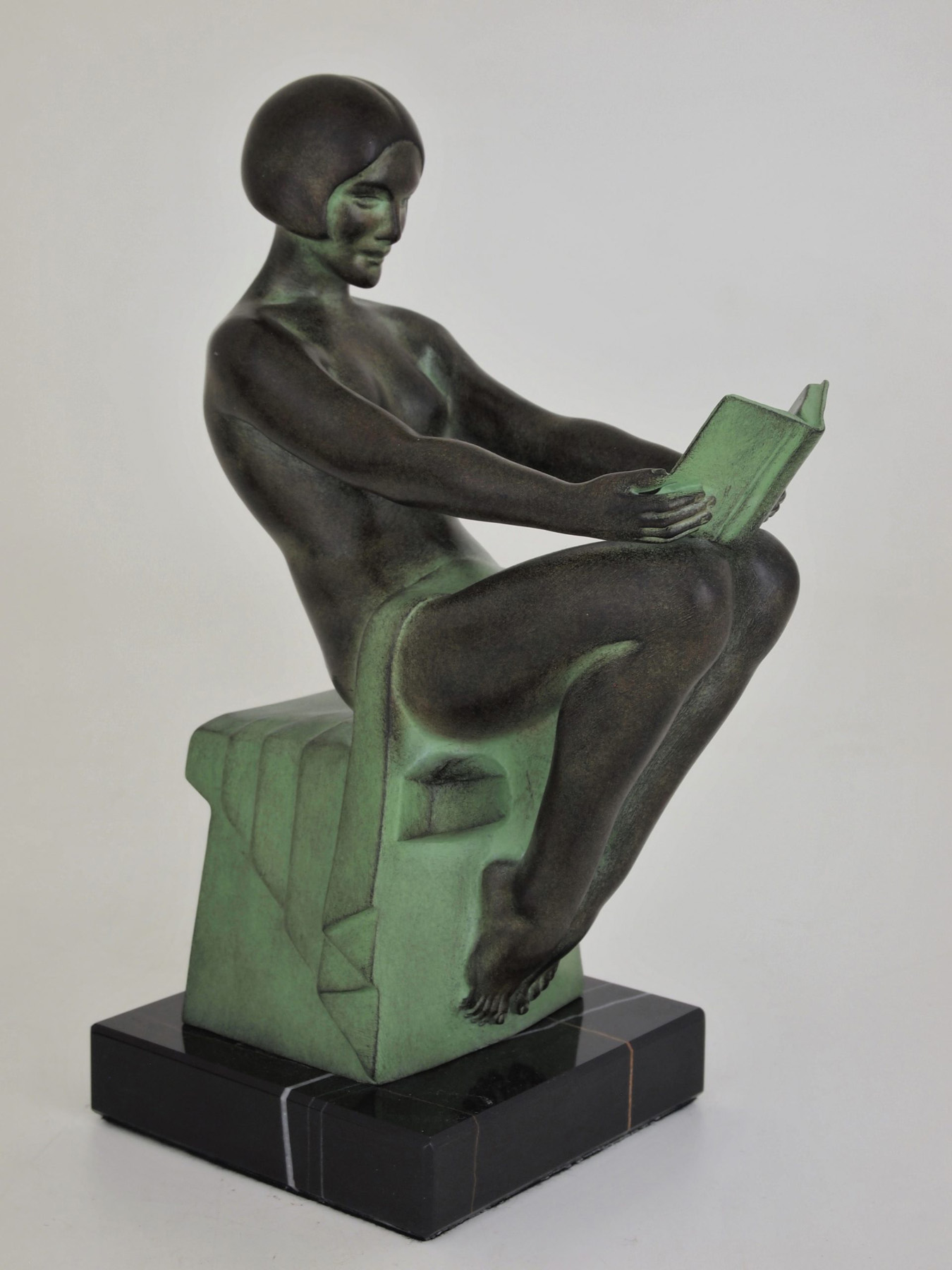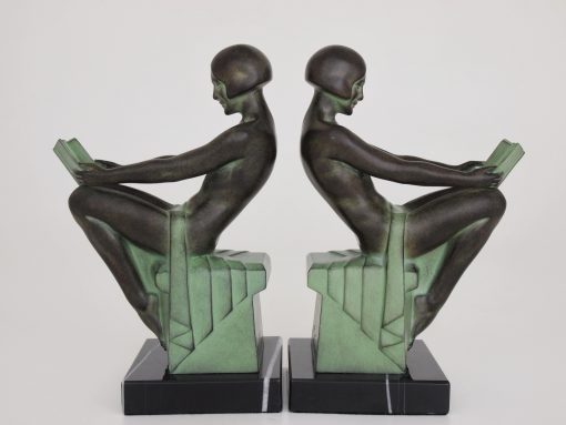 Pair of French Art Deco patinated art metal bookends from Max Le Verrier titled ‘Délassement’ (Relaxation), the design dating from circa 1930.