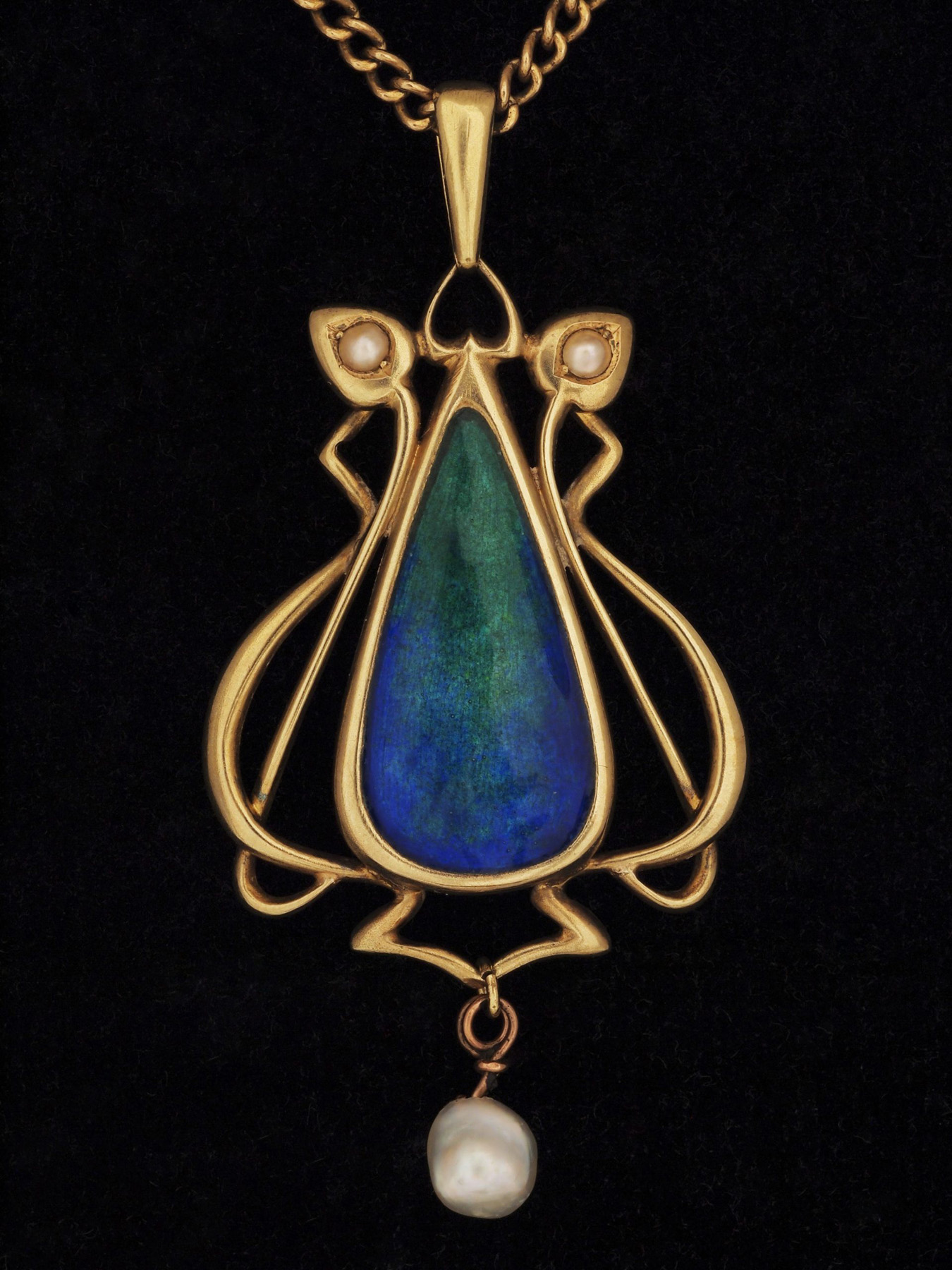 An Art Nouveau design with elegant sweeping lines surrounding a teardrop shaped cebtral section highlighted with richly coloured enamel shading from green to deep blue.