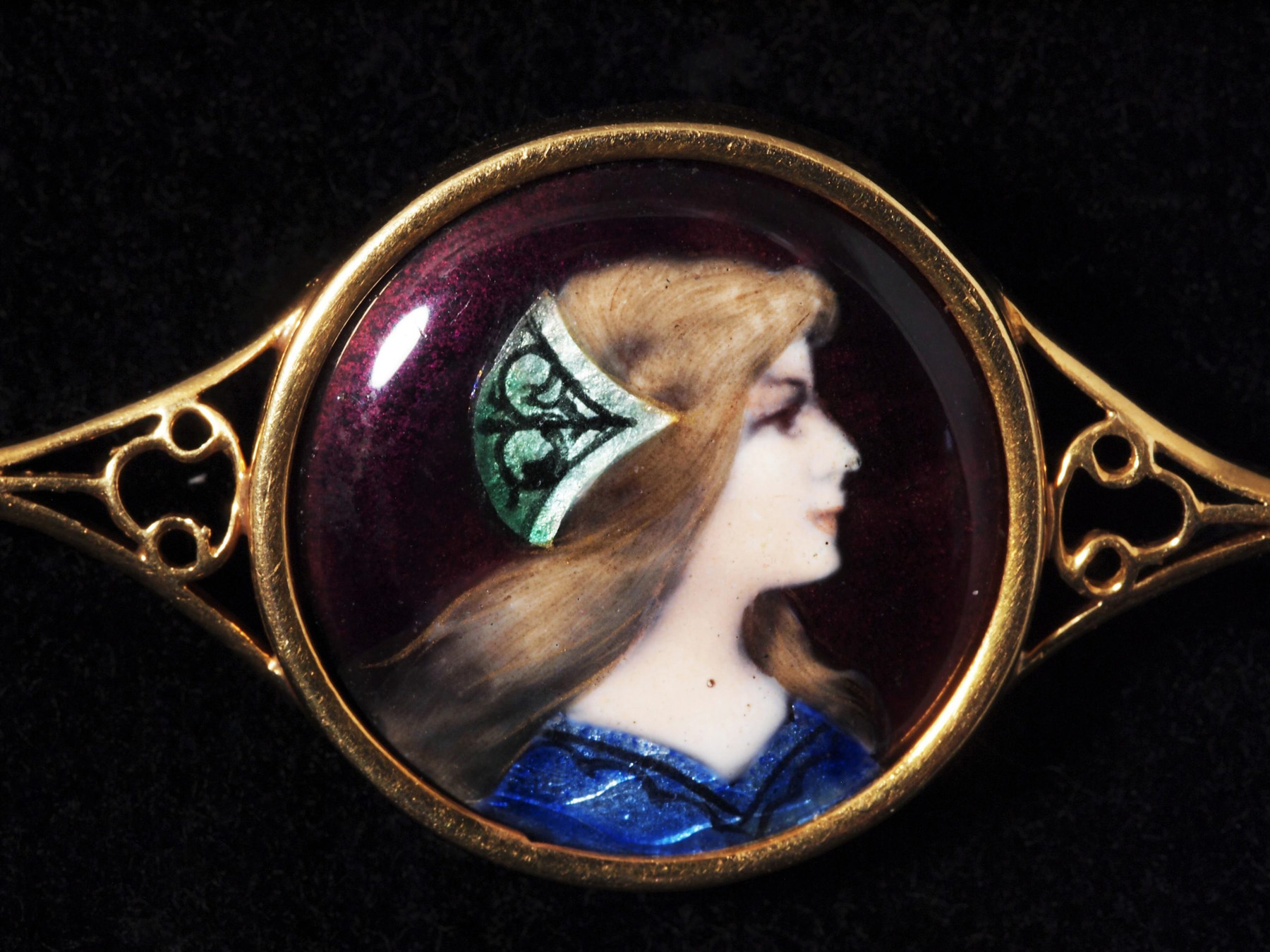 Circular Limoges enamelled portrait of a young woman seen in profile, set in an 18 carat gold mount in the form of a bar brooch.