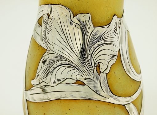 Loetz collaborated with a company in the US known as Alvin who specialized in silver decor on glass, and this vase was almost certainly decorated by them.