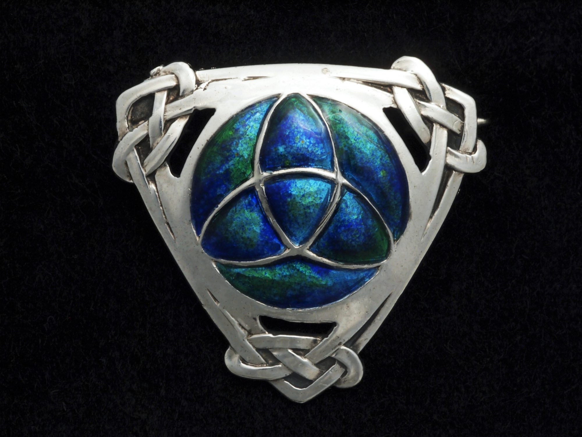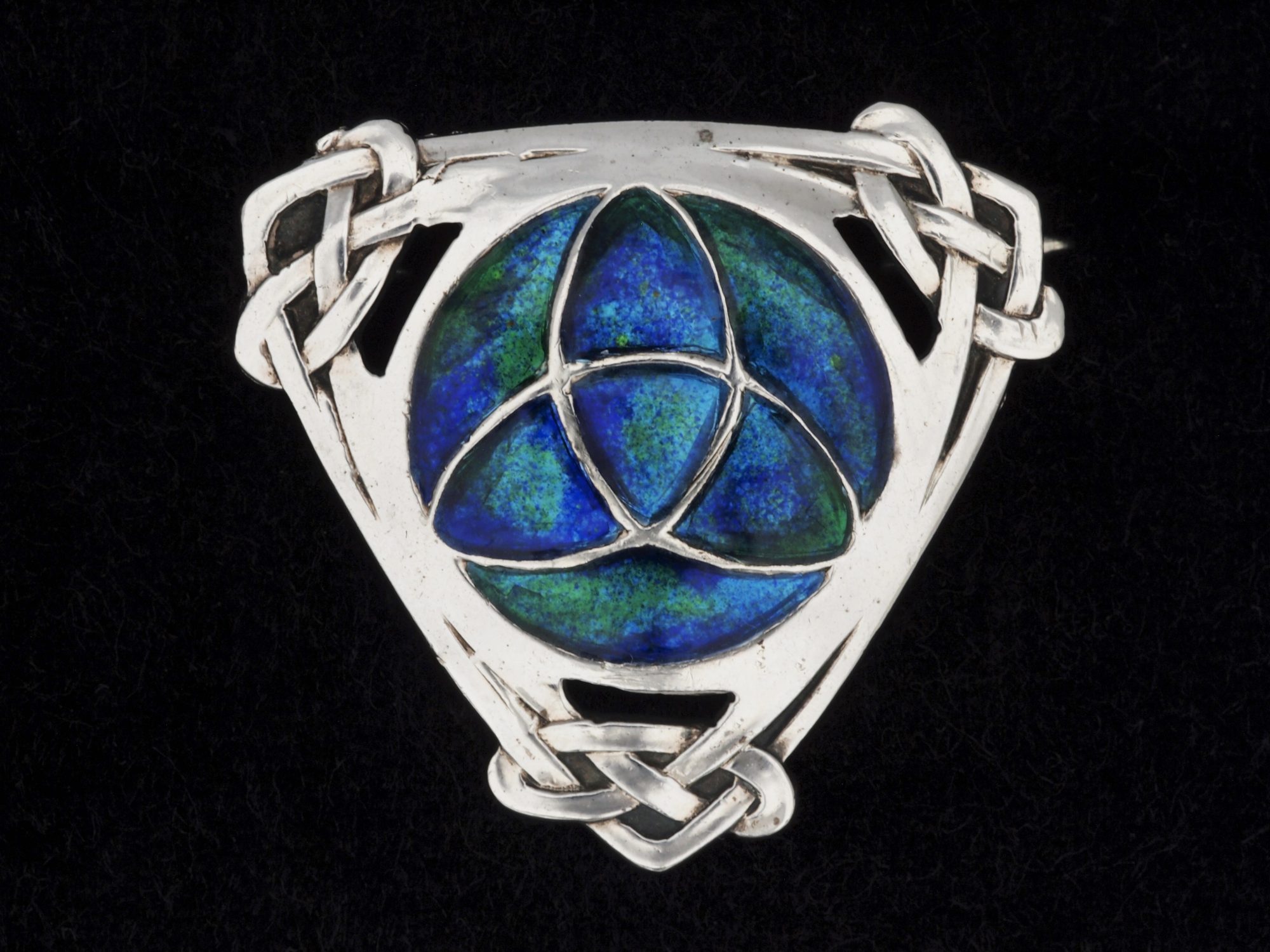 Designed very much in the manner of Archibald Knox with a Celtic knot motif at each of the three corners and blue and green enamel decorating the centre, divided into three equal ellipses.