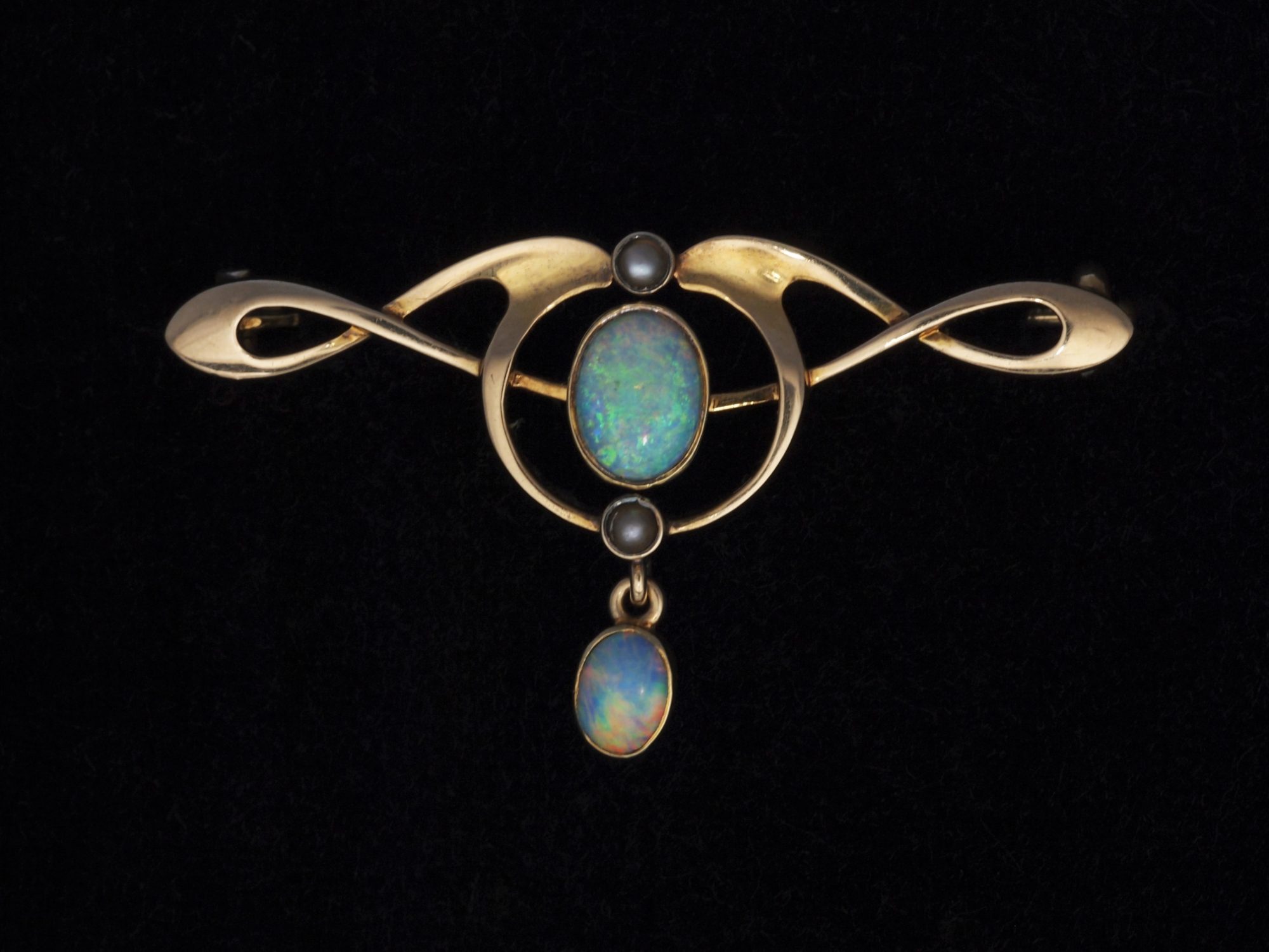 The sinuous lines are evenly balanced on each side, giving the brooch a very fluid look and two small pearls, mounted above and below the central opal, add just the perfect understated detail.
