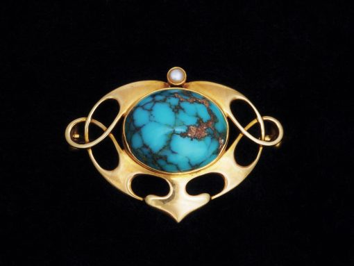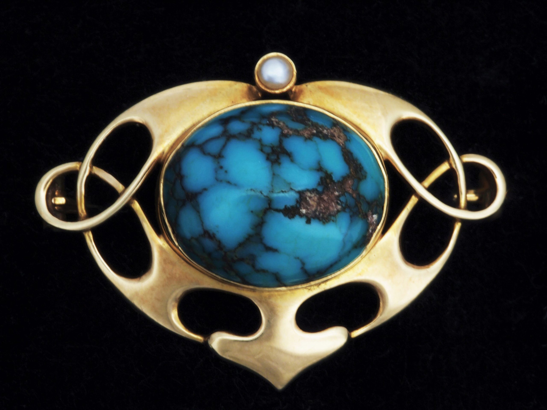 An almost oval outline with a classic entrelac design in the manner of Archibald Knox, and set with a fine turquoise matrix stone in the centre.