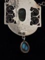 The main pendant hangs on four short lengths of chain from decorative side attachments which connect to the remainder of the necklace chain.