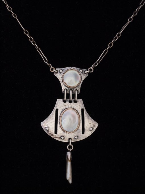 Hammered silver pendant necklace in two sections, each set with an appropriately sized mother-of-pearl plaque in a gold mount.