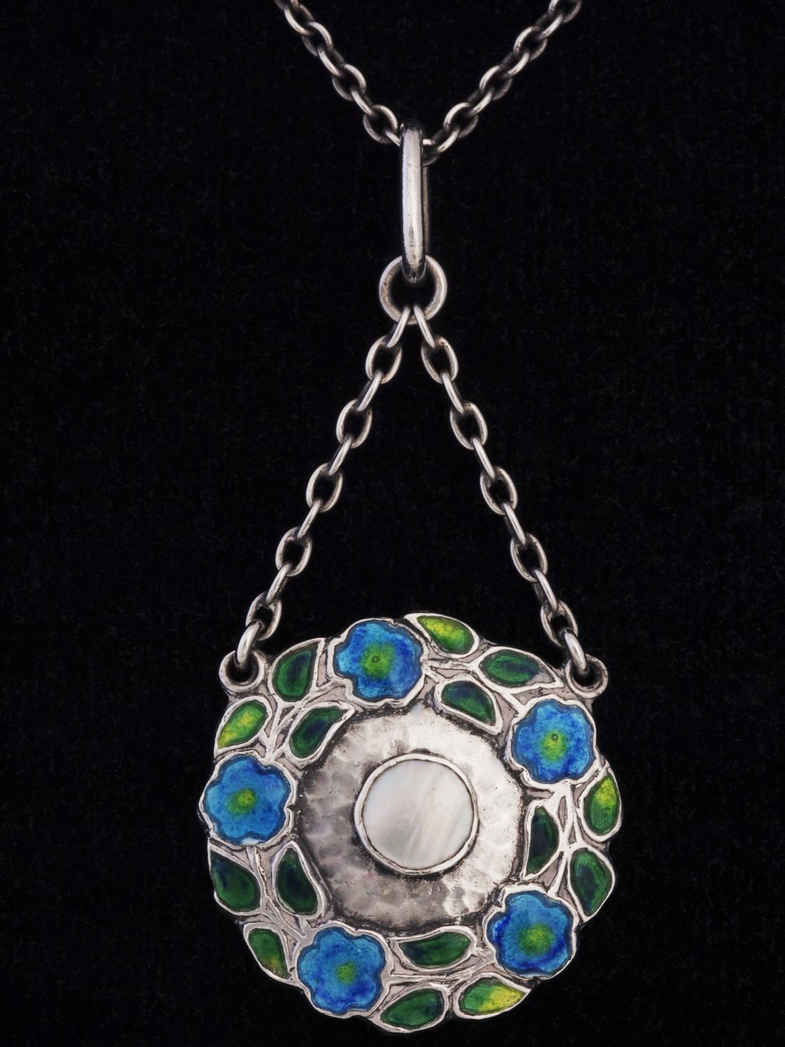 Suspended from the bale on two short lengths of chain, the pendant is in the form of a wreath of blue flowers and green leaves.