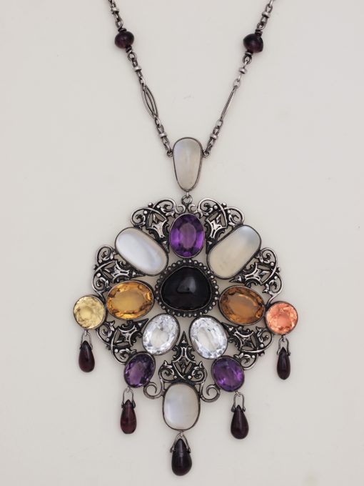Large and impressive English Arts & Crafts silver pendant necklace set with an assortment of stones including amethysts, citrines, garnets and moonstones.