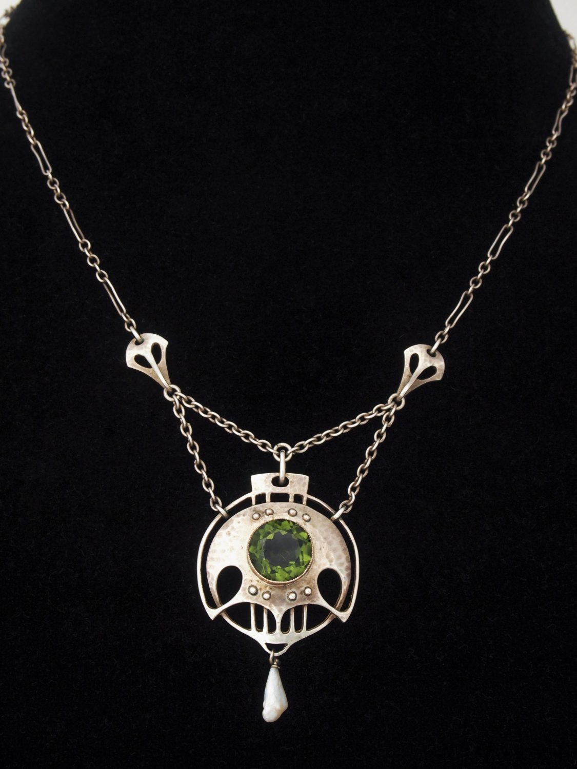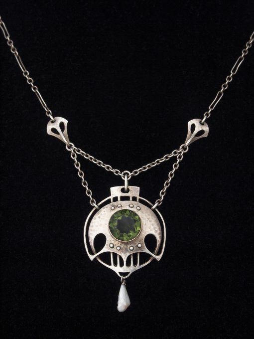 Hammered silver pendant necklace set with a faceted green glass stone that, although unmarked, bears all the hallmarks of having been made by Murrle Bennett & Co.