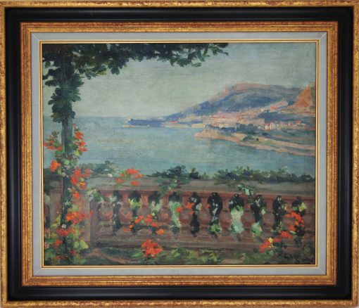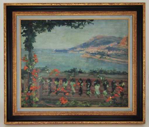 Framed oil on canvas of a balcony scene with a view of a tranquil bay in the background together with a hillside village close to the edge of the shore.