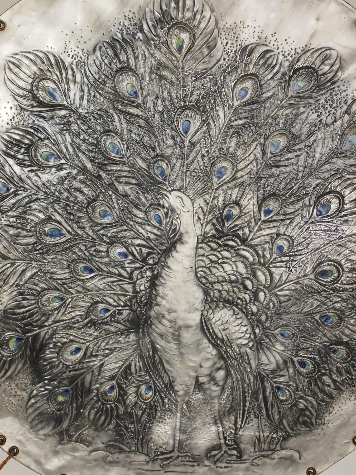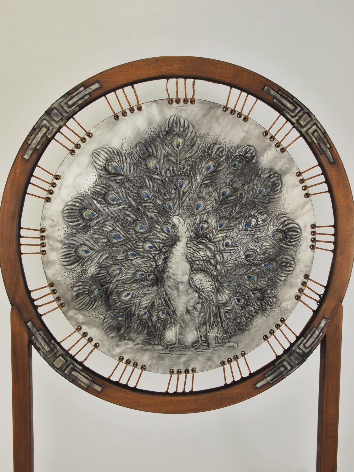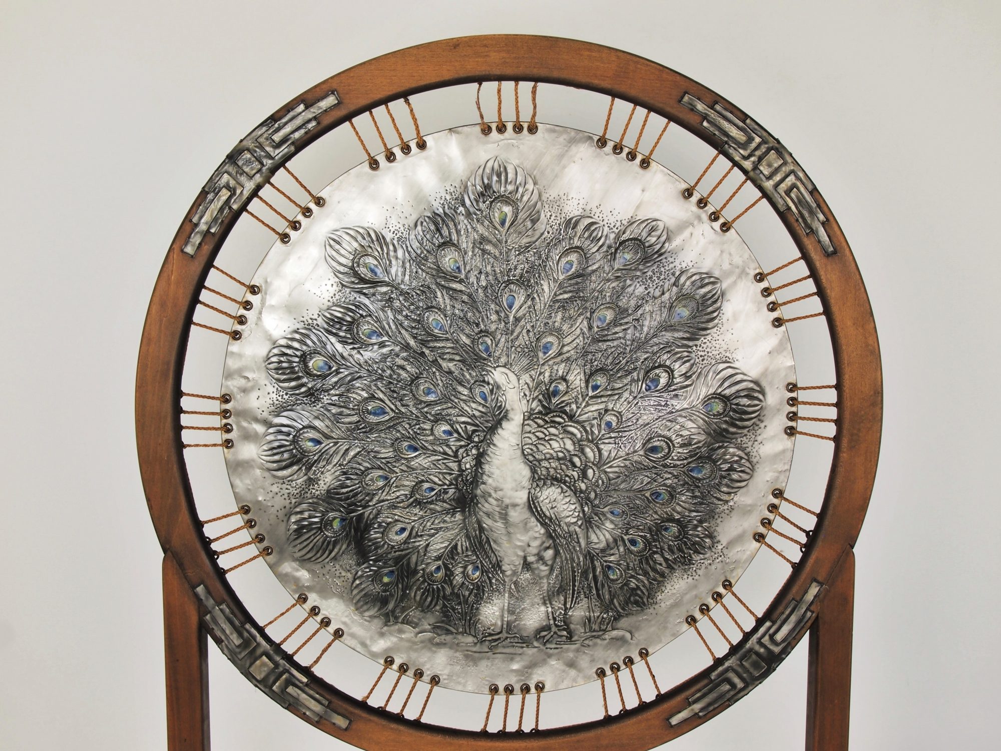 Early Art Deco wooden framed circular fire screen supported on two upright legs, with a metal – possibly pewter – centre panel featuring a splendid peacock, the eyes of his tail feathers enamelled in blue and green.