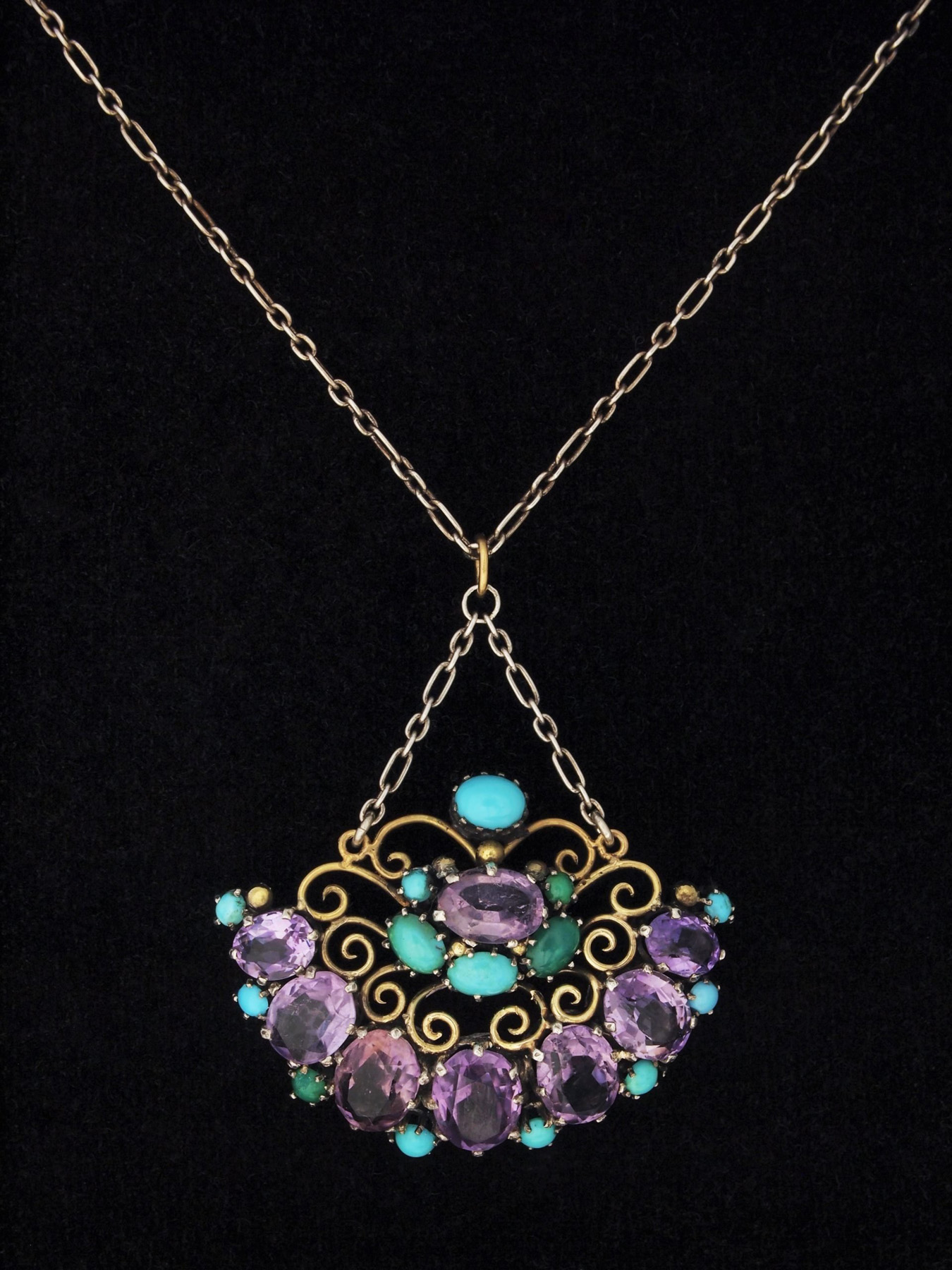 Crescent shaped pendant crafted in both gold and silver, featuring a curved row of oval amethysts with little circular turquoise cabochons between each one along the lower edge.