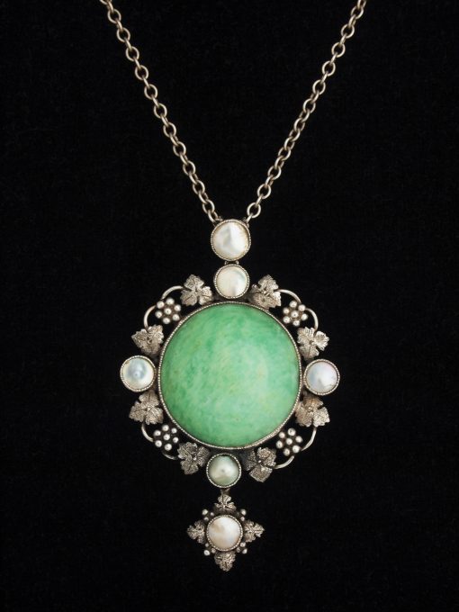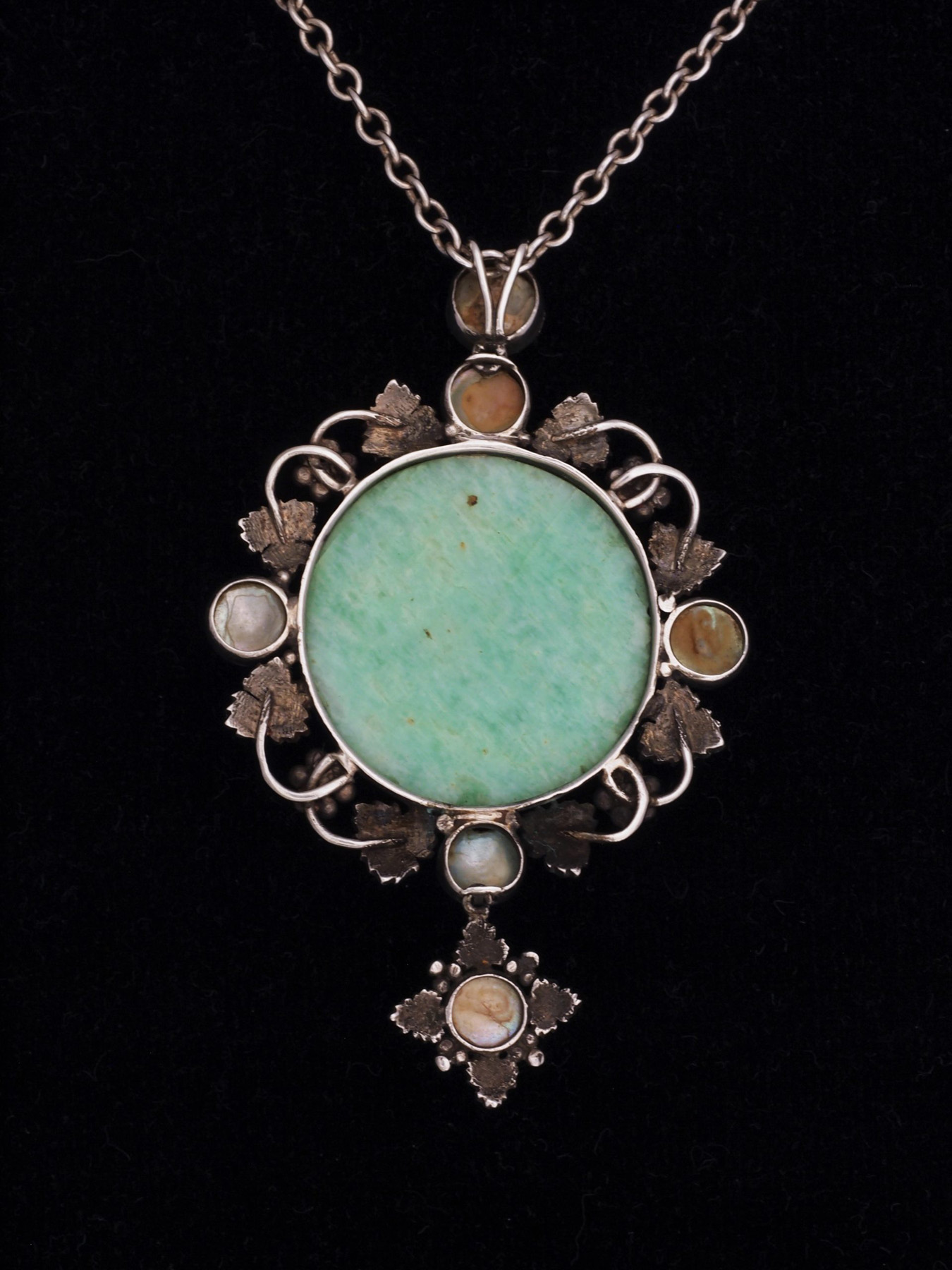 Silver Arts & Crafts pendant with a circular frame of leaves and berries together with equally spaced mother-of-pearl discs, all surrounding a large amazonite cabochon.