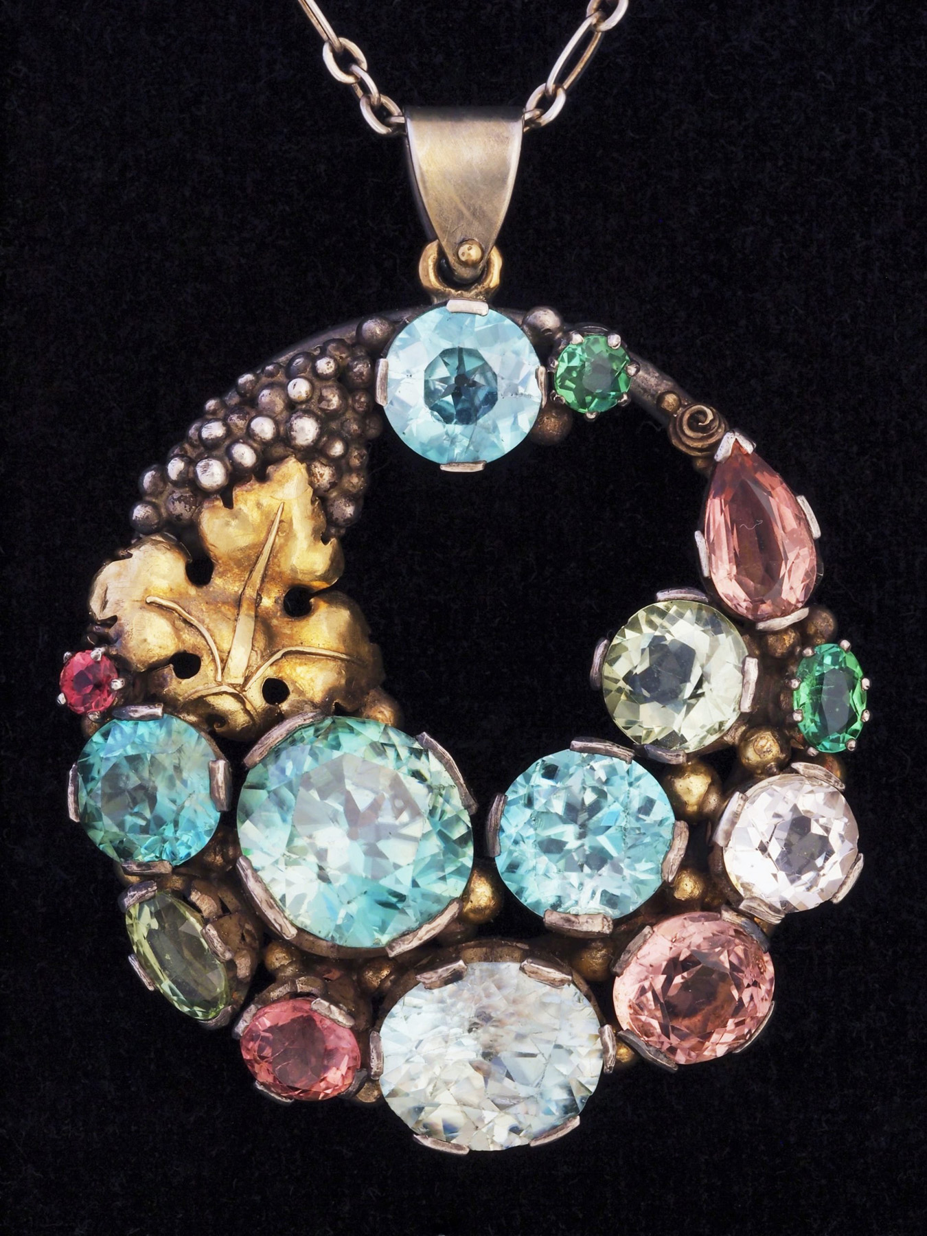 Delightful circular pendant crafted from silver and gold, set with an assortment of faceted semi-precious stones, including zircons, in various pastel hues.