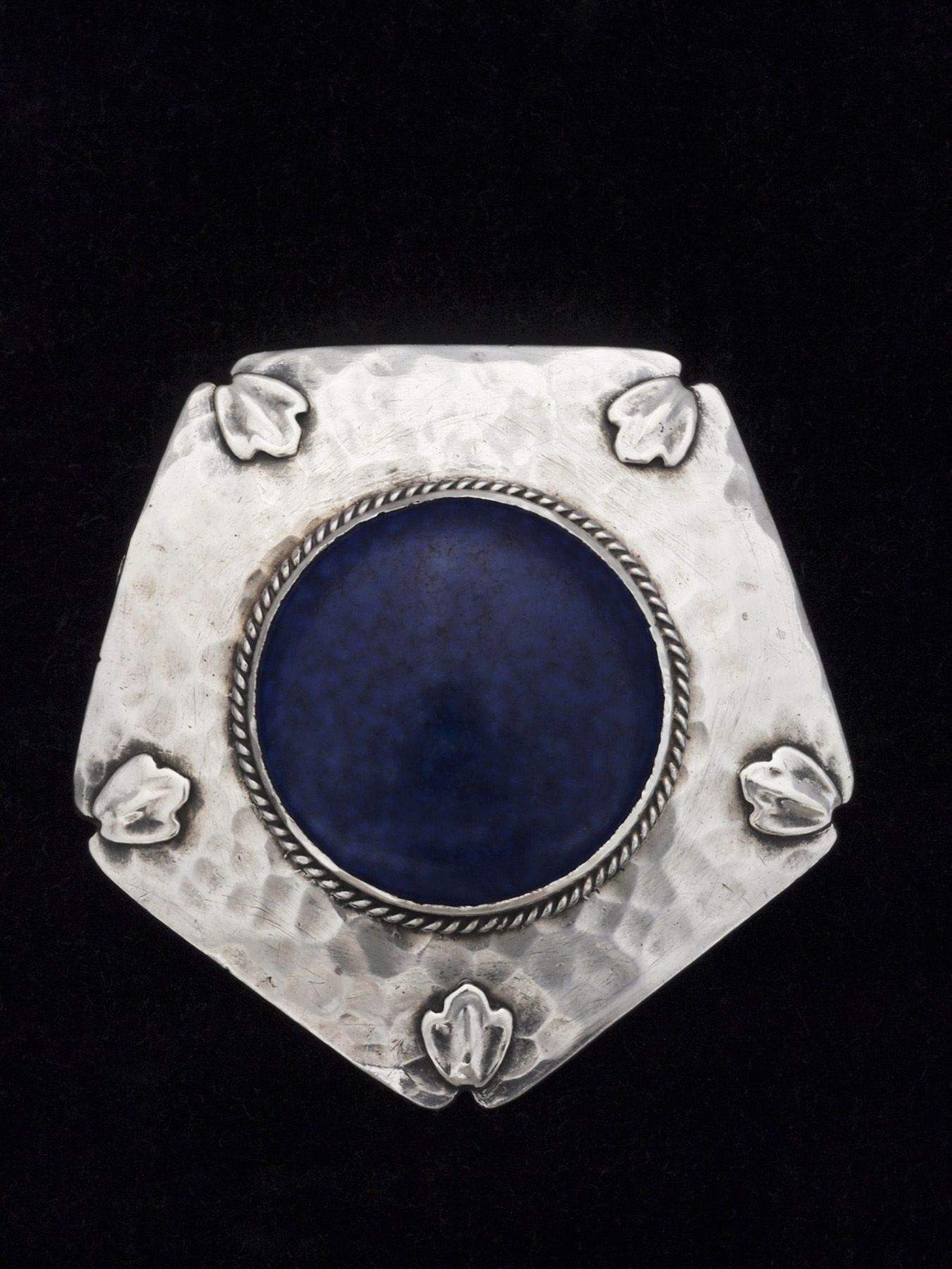 Hammered silver Arts & Crafts brooch with a pentagonal outline, set in the centre with a circular mottled blue matt enamel plaque.