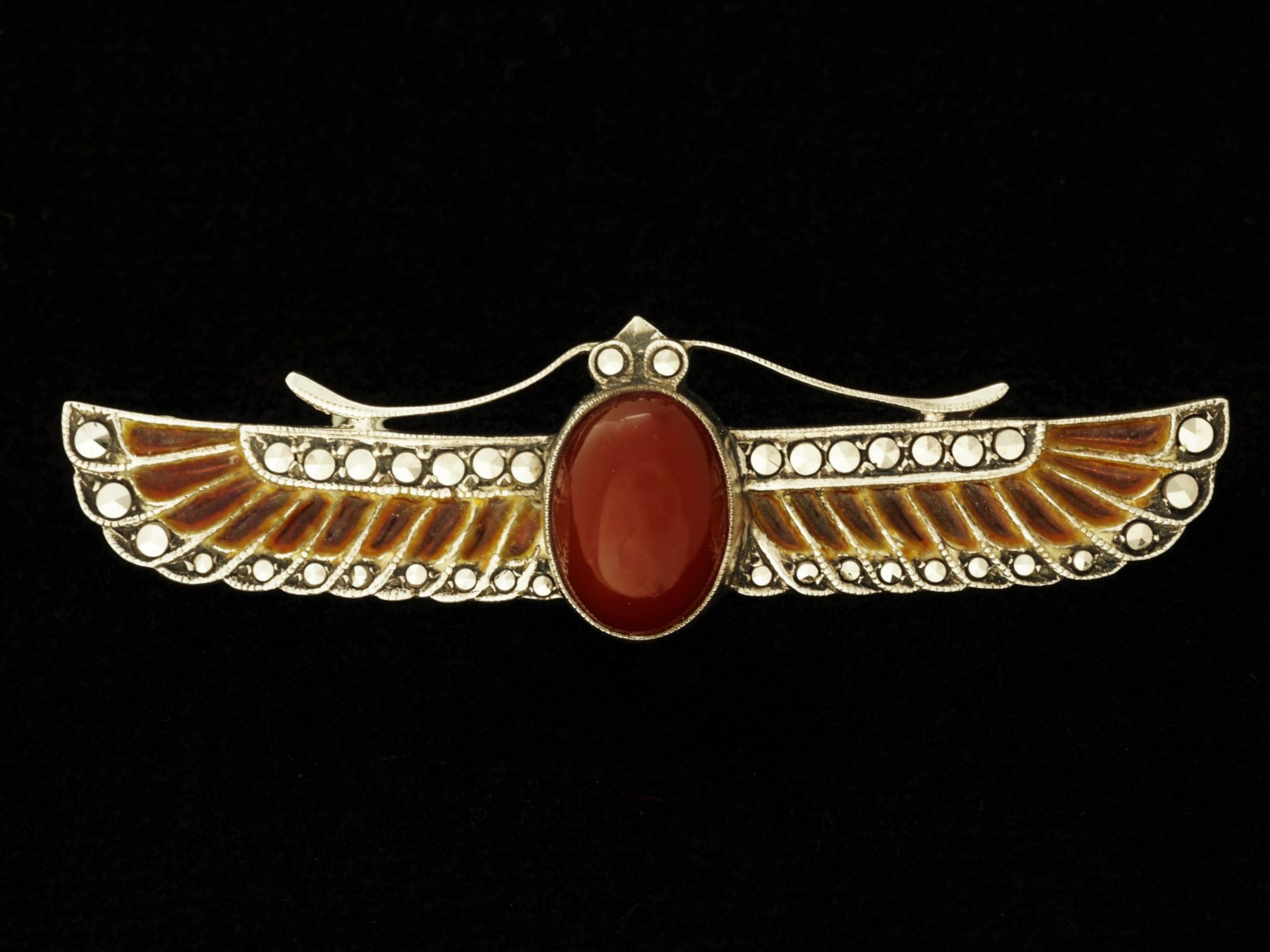 Super Egyptian Revival winged scarab brooch in 935 silver and plique-à-jour enamel, with an oval carnelian cabochon set in the centre, the enamel reflecting the colour of the stone.