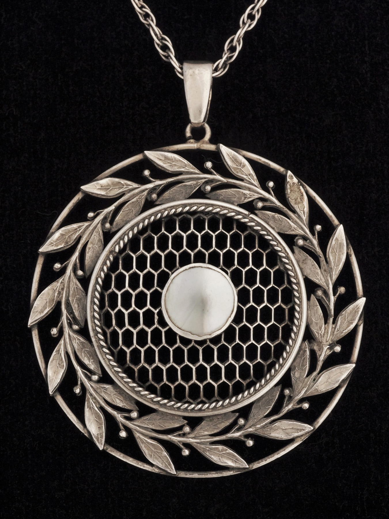 Circular Arts & Crafts pendant with a garland of leaves detail framing an inner, gently contoured meshwork design which in turn surrounds a set mother-of-pearl plaque.