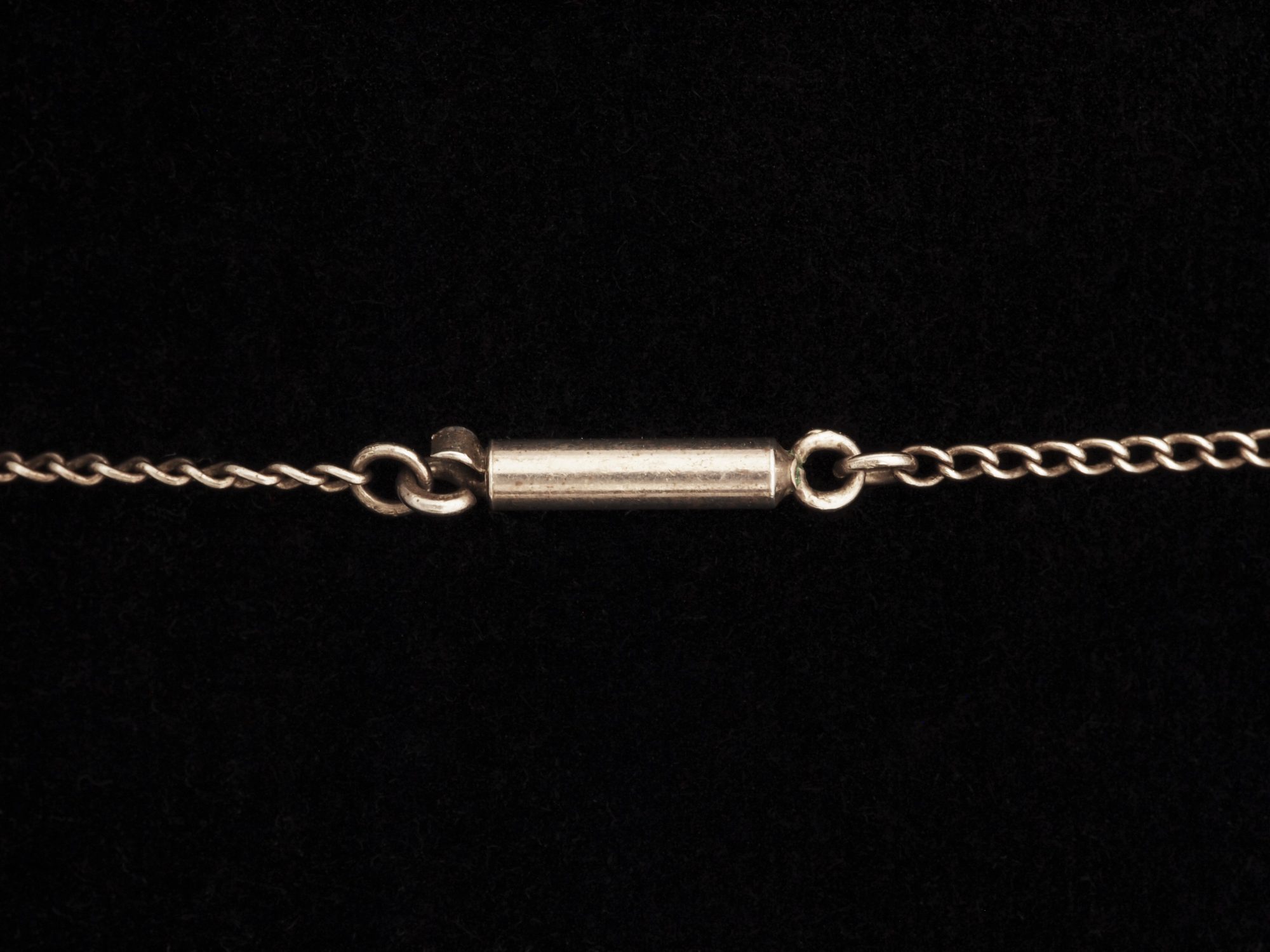 Approximately 2.5 cm wide. The silver necklace chain has a barrel type clasp and measures 43 cm in length.