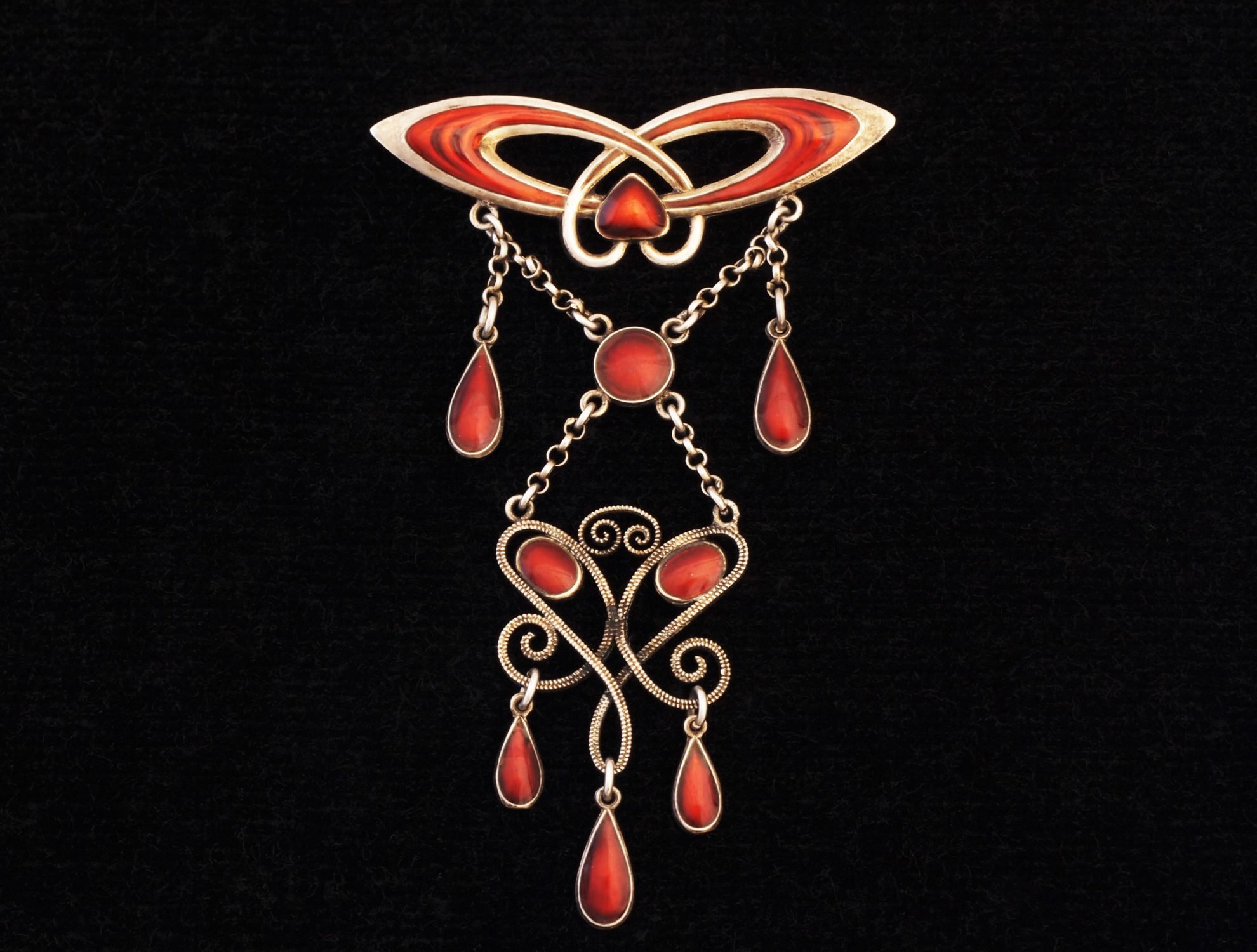 Dating from the early 1900’s this ornately designed brooch with its vibrant red enamelling features a sweeping Art Nouveau inspired top section completed with a little inverted heart in the centre.