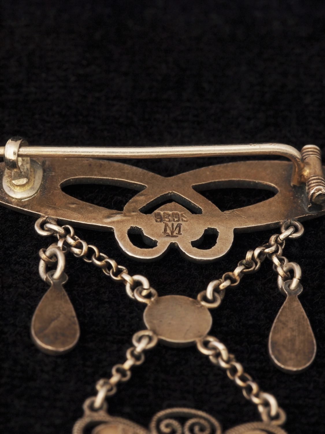 Skønvirke festoon brooch crafted in silver gilt by the Norwegian master jeweller and silversmith Marius Hammer.