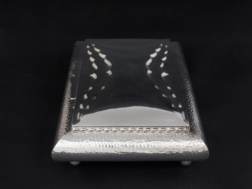 Good size hammered silver box on four rounded feet with a distinctive ‘wave’ design mirrored on the front and back of the gently domed hinged lid.