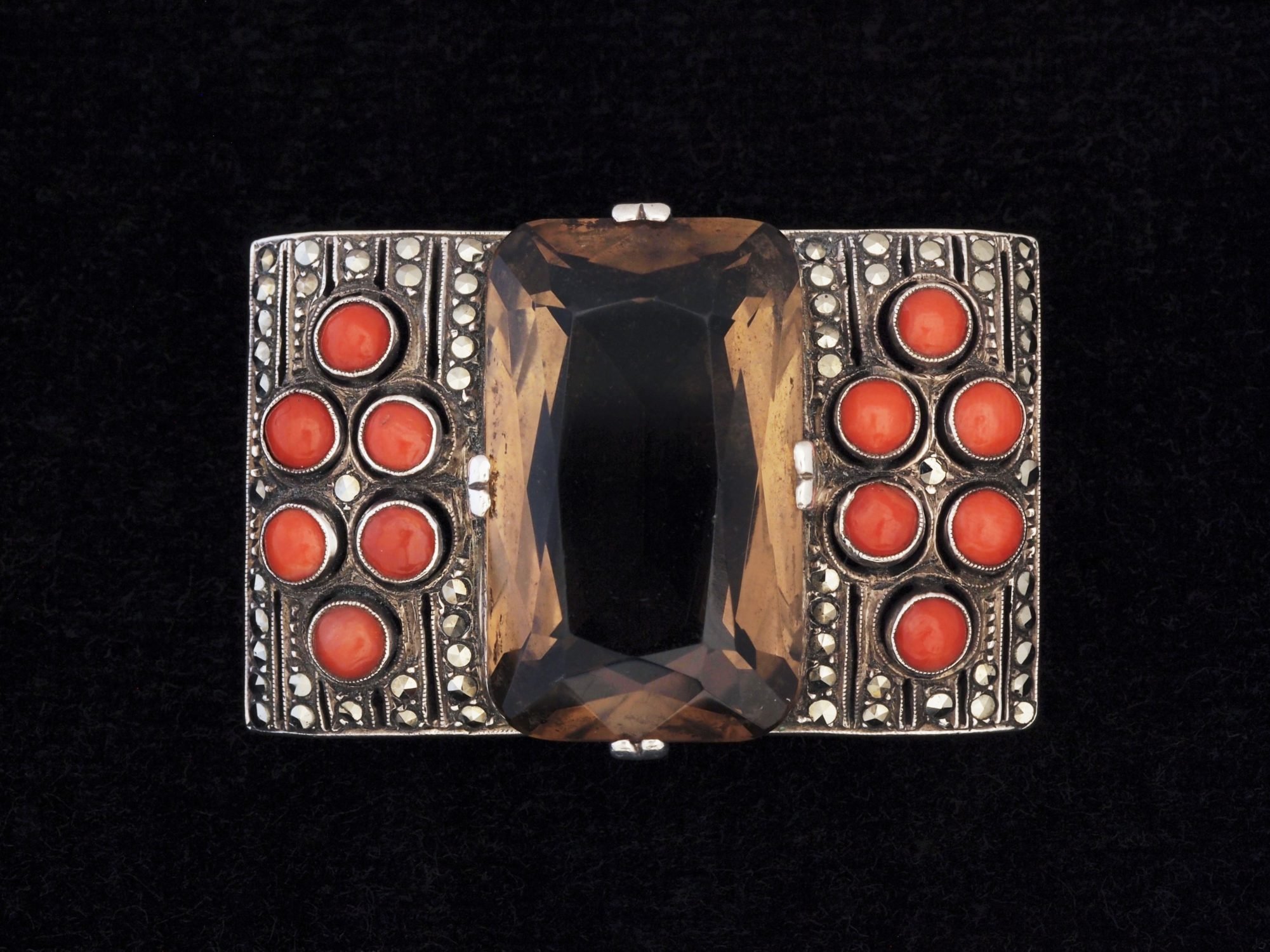 Rectangular in outline and contoured at each side, with a prominent smoky quarts stone set in the centre.