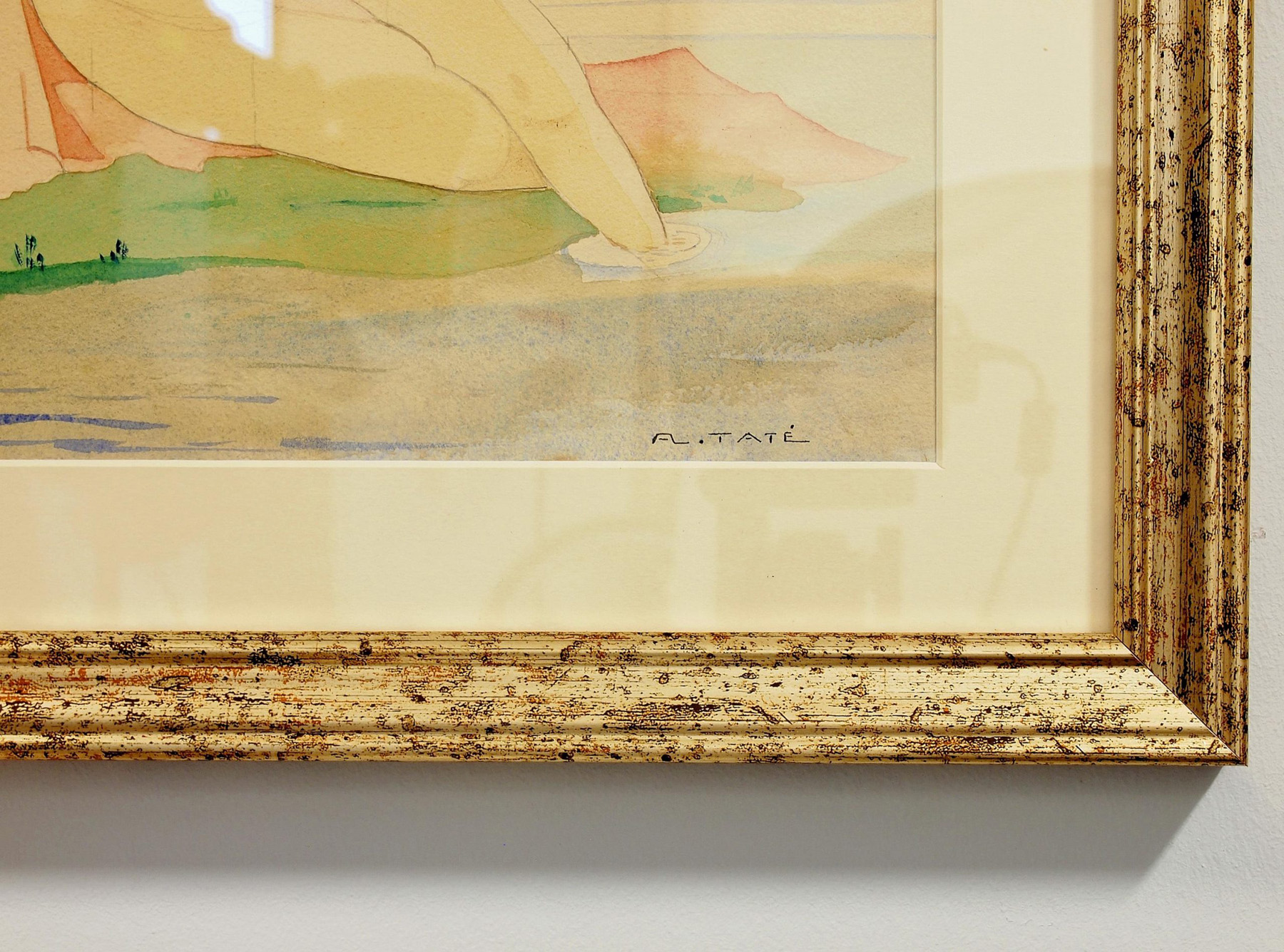 Art Deco era watercolour by the French artist A. Taté of a loving couple in a waterside setting.